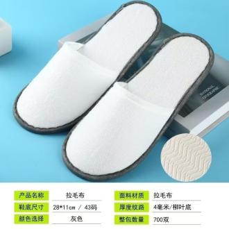 拉毛拖鞋鞋底:4mm水波纹压麻 帮面:拉毛复合2mm海绵 盖面:拉毛布复合2mm海绵 包边条:灰色无纺布包边 内衬:无纺布(700/包)整包发货